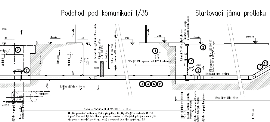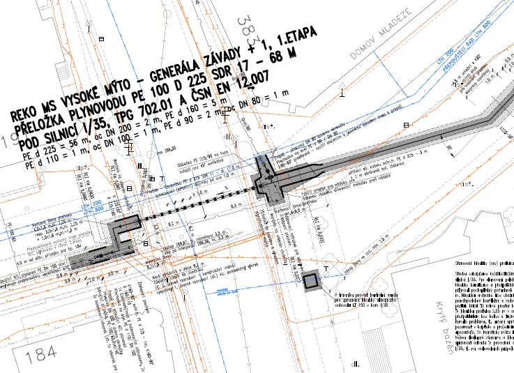 Vzhledem k rostoucím nejistotám o technickém stavu plynovodu pod frekventovanou komunikací I/35 bylo nezbytné rozdělit původní stavbu na dvě etapy a první – s řízeným protlakem pod komunikací I. třídy. realizovat ve velmi krátké době. Pod komunikací byla vtláčena ochranná trubku PE d 315. Velký význam stavby byl ve stabilizaci tlakových poměrů v síti NTL ve městě související s celkovým plánem obnovy. Odhalená překážka před finálním propojem byla projekčně dořešena shybkou.