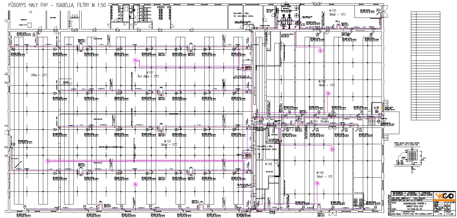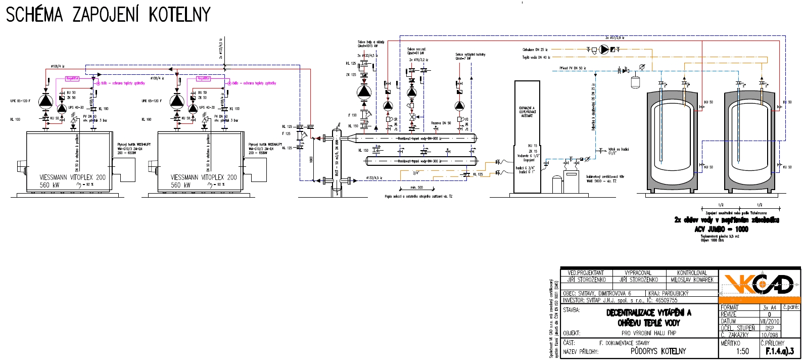 Instalovaný výkon plynové kotelny FHP 1,3 MW a NETEX 0,7 MW. Včetně soustavy otopných těles a 70 ks teplovzdušných jednotek. Zvoleny plynové kotle Viessmann Vitoplex
