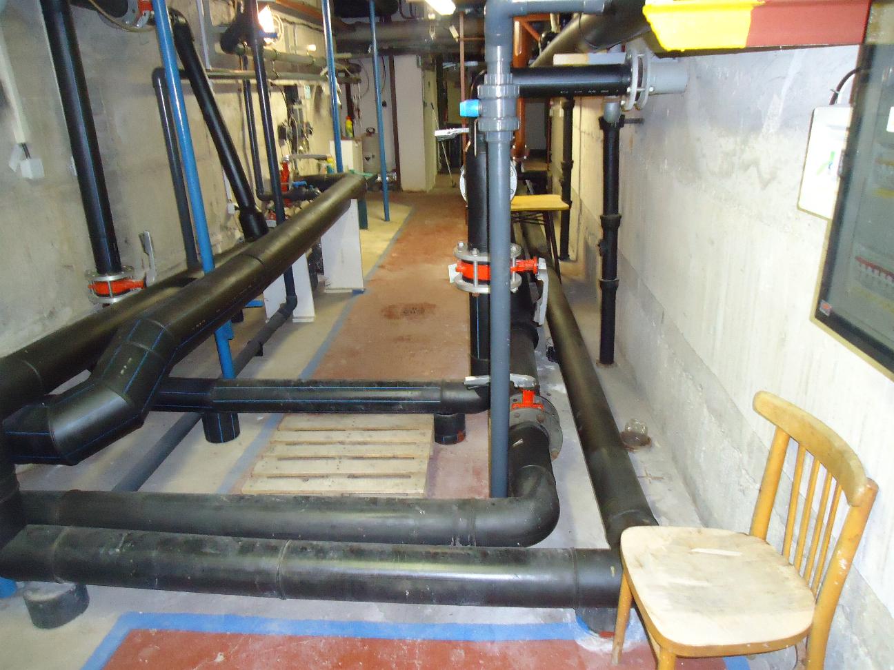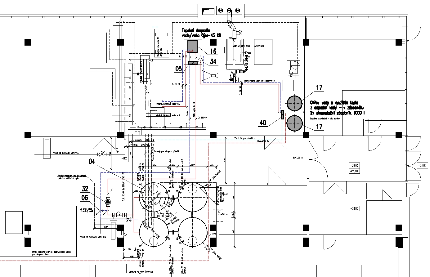 Hlavním nástrojem pro odběr tepla je tepelné čerpadlo voda/voda o tepelném výkonu 43 kW. Rekuperace tepla z odpadní vody.