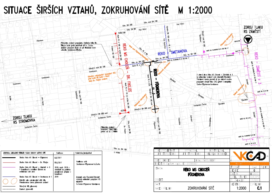 Během projekční přípravy související stavby obnovy místní sítě v sousední ulici Dr. Fikejze vzneslo město Choceň žádost o zrušení stávající páteře v areálu mateřské školky, obcházející její budovu. Vznikl tak další koncept obnovy sítě se zajištěním nového propojení regulačních stanici ve městě s cílem stabilizace tlaku v NTL síti. Stavba v ulici Fügnerova tak byla technologických důvodů podmiňujícím předpokladem stavby v ulici Dr. Fikejze a bylo nezbytné jí v krátké době vyprojektovat a realizovat. Stavbu se podařilo uzavřít v termínu potřebném pro následnou realizaci oprav plynovodu v ulici Dr. Fikejze.